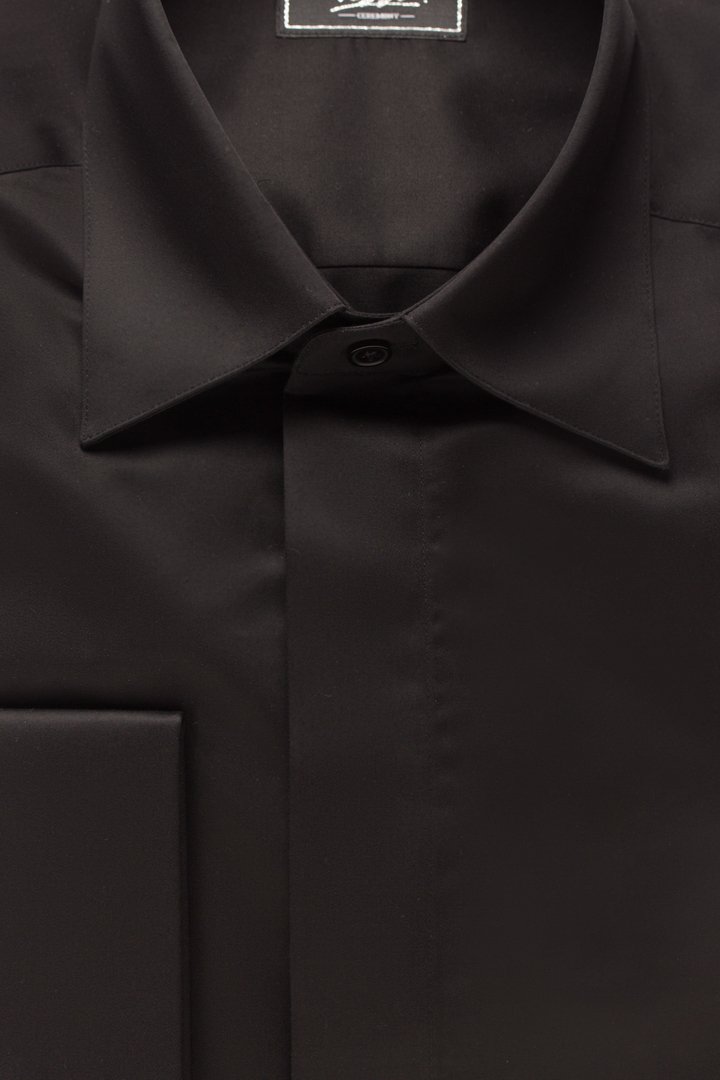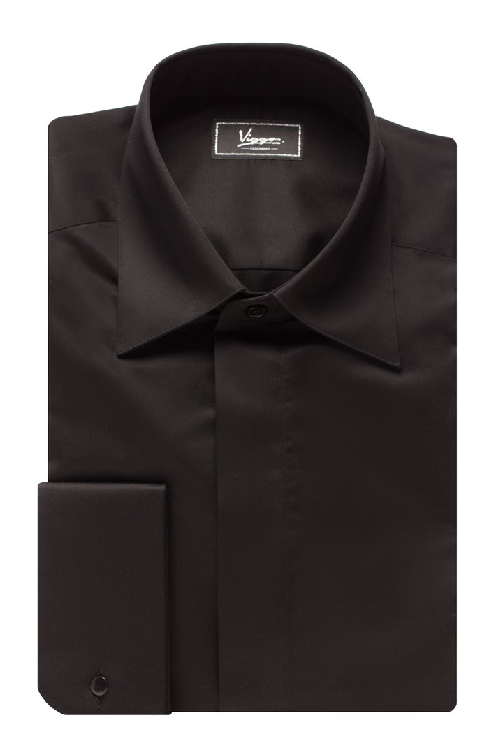 Neagră, simplă, nasturi ascunși,manșete de butoni, guler cravată