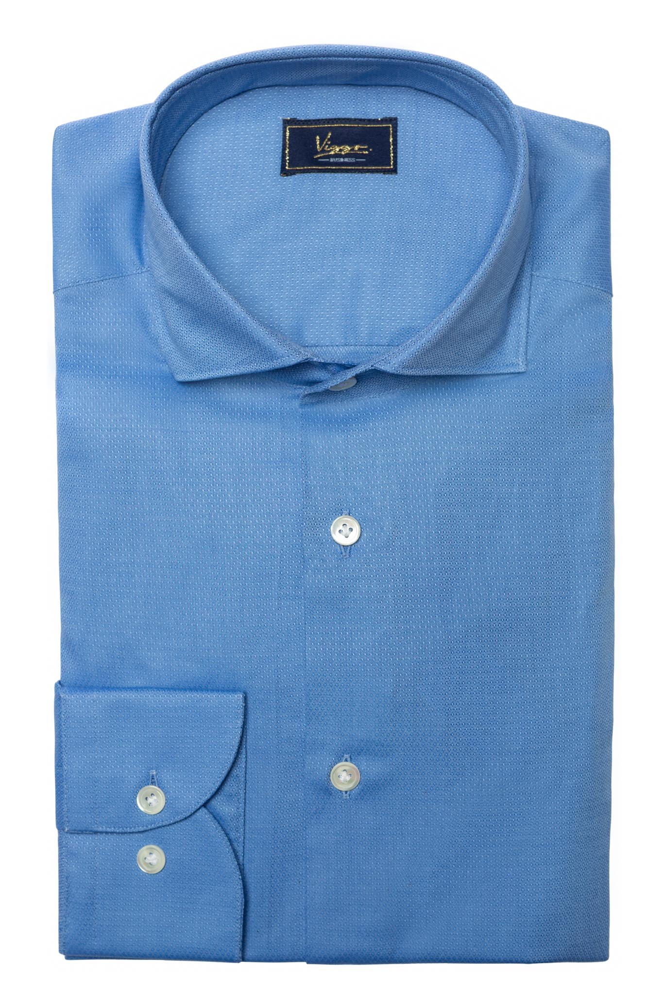 Camasa business albastra texturata fin, guler cravata, mansete nasturi, nasturi la vedere.
