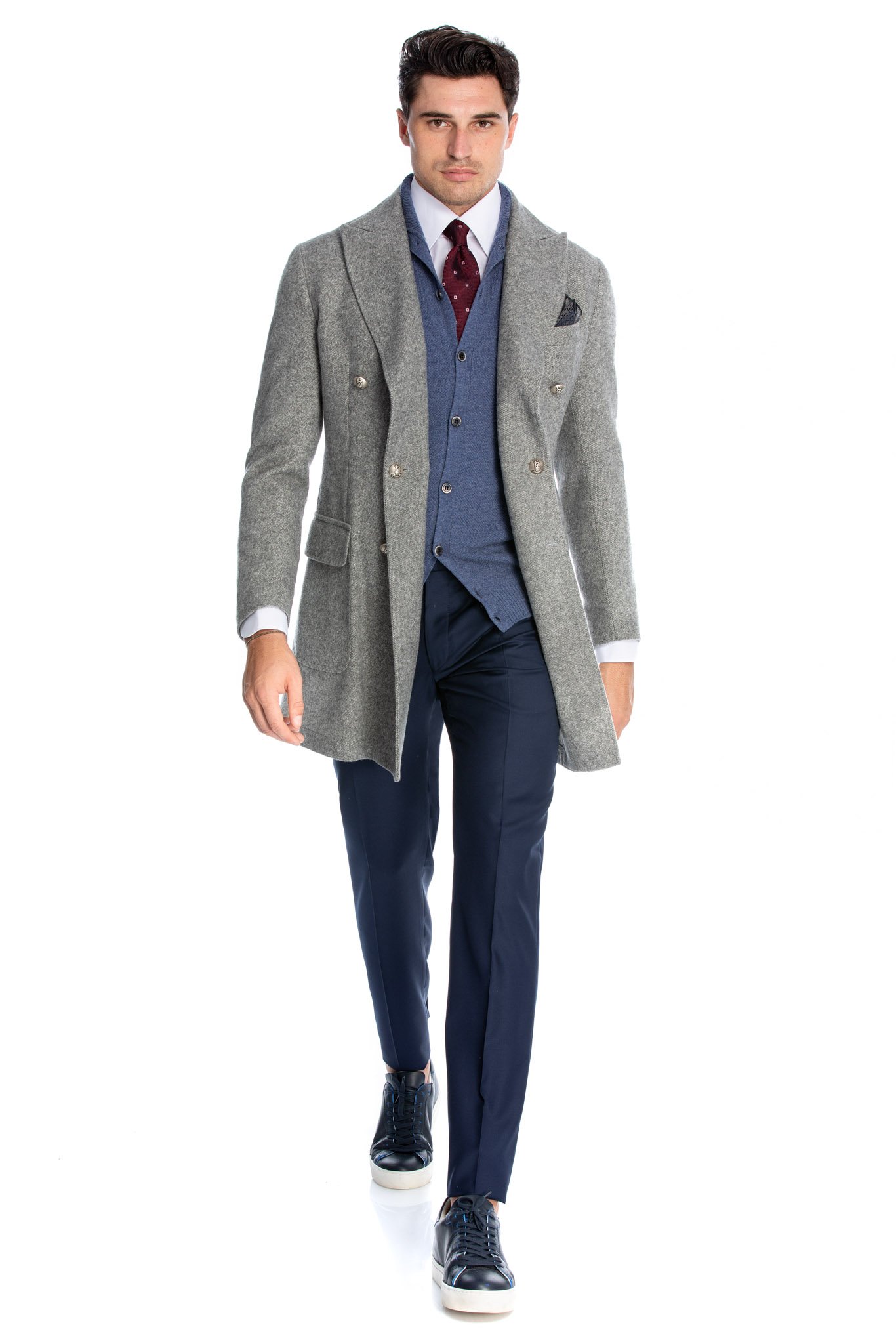 Palton casual gri la 2 randuri de nasturi metalici argintii, rever spit lat, buzunare aplicate cu clapeta, buzunar interior.