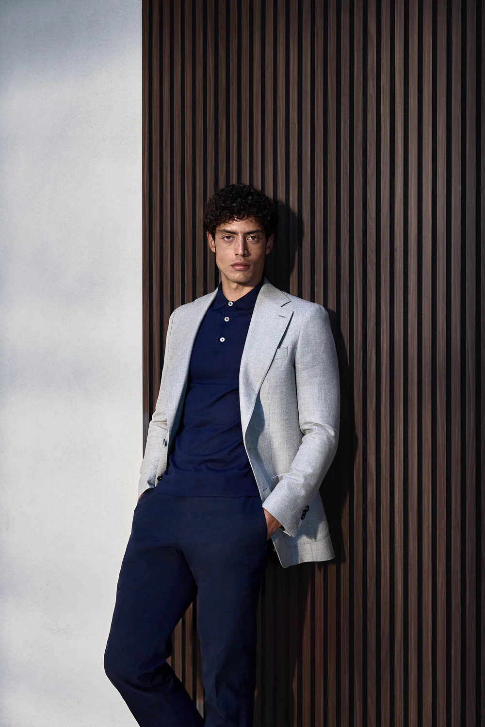 Realizat din tesatura Vitale Barberis Canonico, un amestec nobil de lana virgina si casmir, sacoul ofera o structura eleganta fara a compromite confortul. Pentru un aer modern, piesa se combina perfect cu o bluza cu guler Polo, oferind o alternativa contemporana la camasa clasica.
