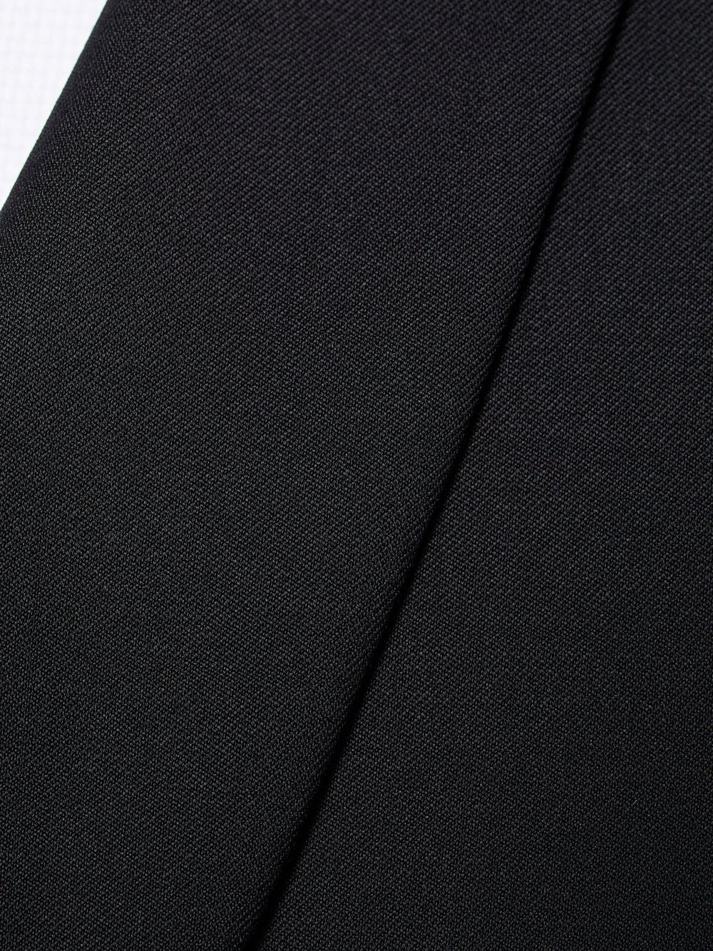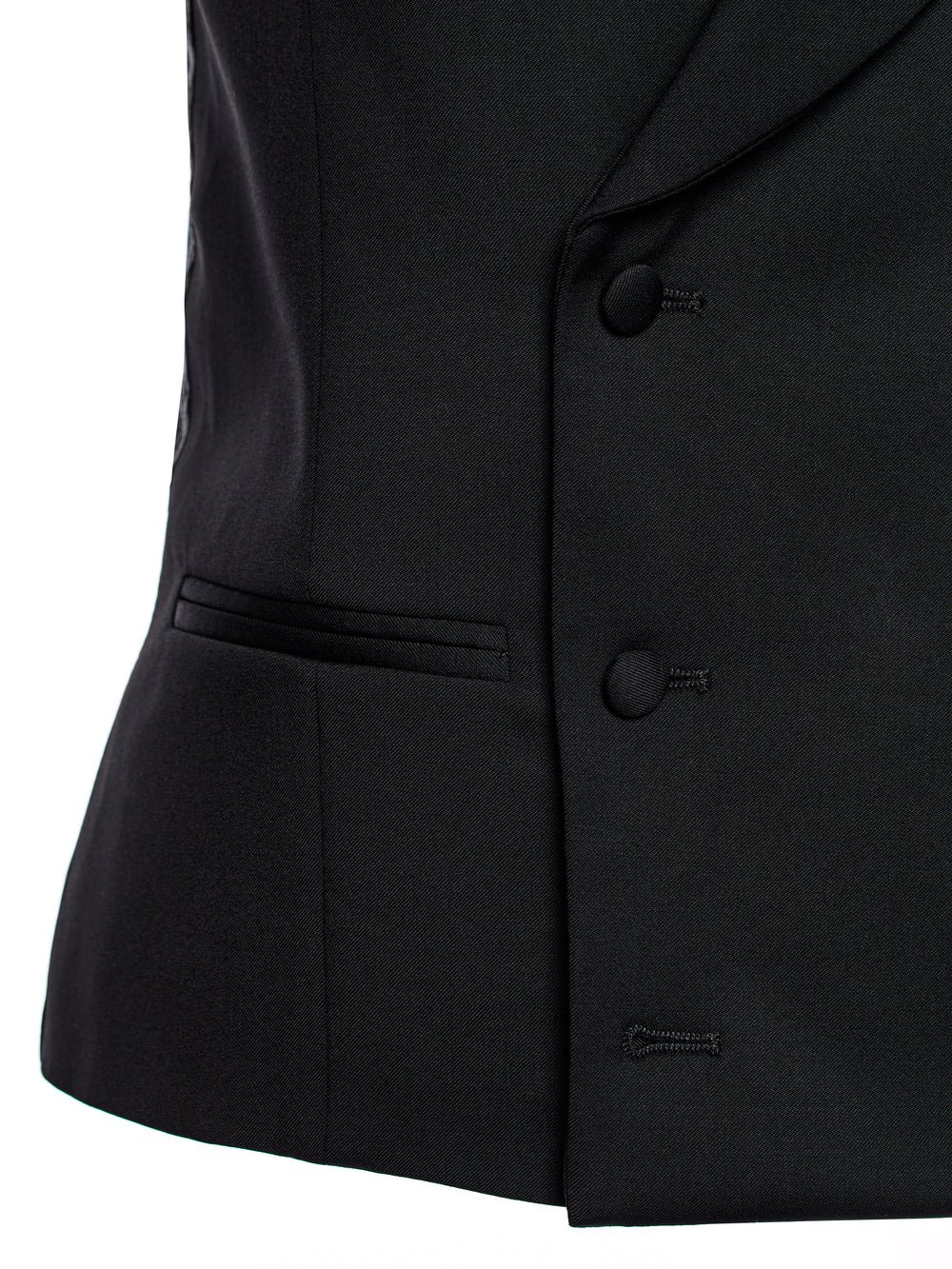 Vesta de ceremonie neagra la doua randuri de nasturi cu rever sal, nasturi imbracati in acelasi material si doua buzunare cu refileti.